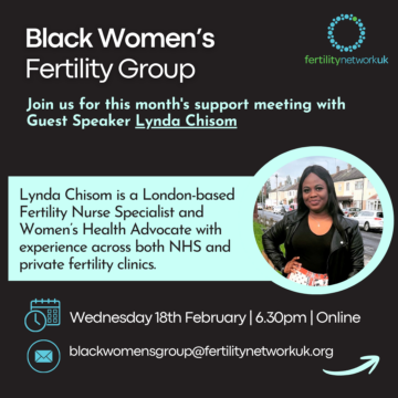 Our February Black Women’s Fertility Support Group meeting will take place on Wednesday 18 February at 6.30pm, with Lynda Chisom joining us as guest speaker.